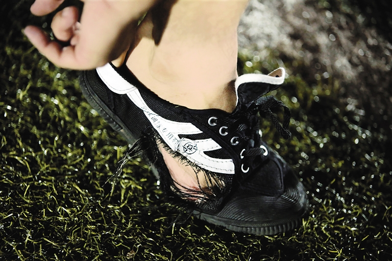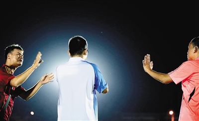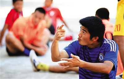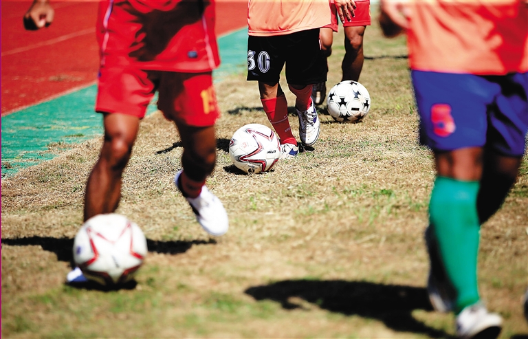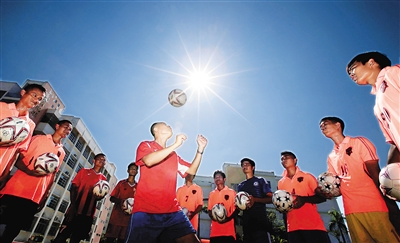 在他们不远处的操场当中,18名主力队员正在烈日下,一会儿练习盘球过桩,一会儿练习头部颠球,接着再带球绕圈,随后进行脚踢排球比赛……训练的内容很多,但是一次一次地重复,其枯燥程度可想而知。此时的他们,早已汗流浃背,但是,并没有停下来的意思。