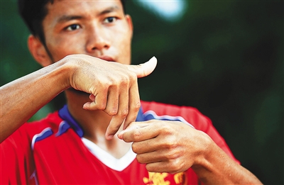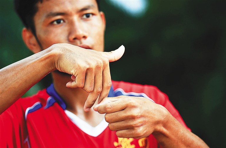 来自海口农村地区的张运彪,生下来便失聪,他用手势告诉海南日报记者,他今年28岁,但是从2003年开始踢到现在有12年了。像其他队员一样,他为了球队,放弃了更好的异地工作的机会,留在海口打工。