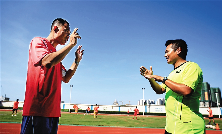 “你跟队员们好好说说,今天我们重点练一下442阵型的战术……”9月6日上午,在海南海口特殊教育学校,烈日当空,操场边上,海南省聋人足球队的教练梁其道,正在一边靠讲一边靠基本的哑语手势,跟副教练高日晓进行沟通。梁教练的一些技战术思路,需要聋哑人高日晓通过专业哑语,向队员们更准确地传达。