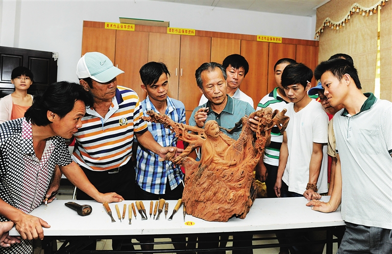 9月12日,澄迈县文化馆举办花瑰艺术培训班,培养学徒,传承非物质文化遗产。图为非遗传承人徐日龙在传授花瑰艺术的工艺流程与技巧。