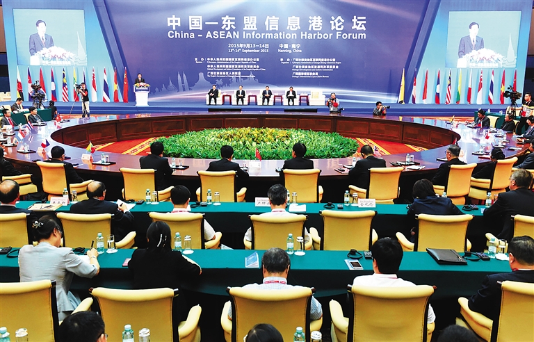 9月13日拍摄的广西南宁市中国-东盟信息港论坛开幕仪式现场。 当日,中国-东盟信息港论坛在广西南宁市开幕,主题为“互联网+海上丝绸之路—合作·互利·共赢”。中国-东盟信息港论坛由国家互联网信息办公室、国家发展和改革委员会与广西壮族自治区人民政府共同主办。论坛为期两天,来自中国及东盟十国的280多位政府、企业和学术界代表参加论坛。 新华社记者 周华 摄