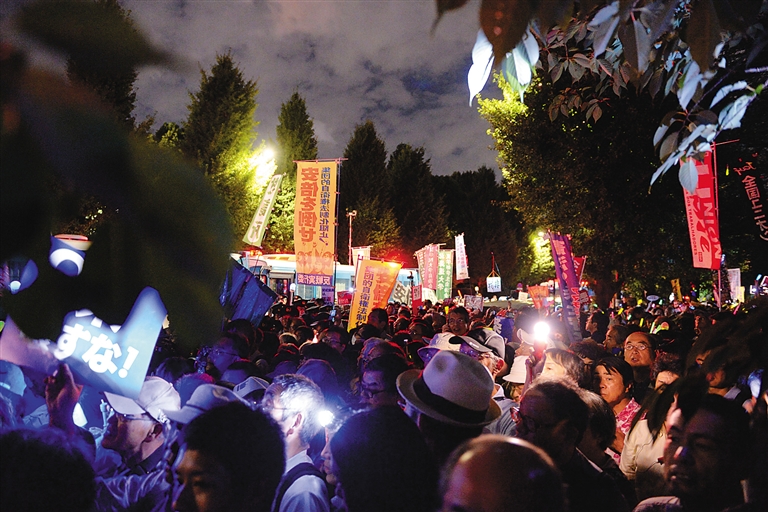 当晚,来自日本全国各地各个年龄层的众多民众手持荧光棒与各种反战、反安倍标语包围了国会,国会在野党议员也加入集会者行列。抗议民众高呼口号,要求“安倍下台”,“坚决反对强行表决通过安保法案”。