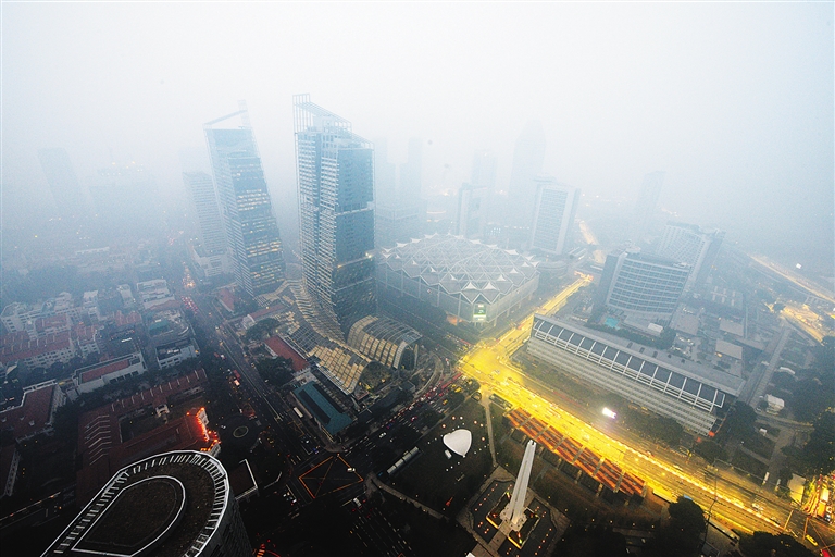 9月14日,烟霾笼罩新加坡行政文化区。 当日,新加坡污染指数(PSI)于下午6时一度达到150的不健康水平。新华社发(邓智炜摄)