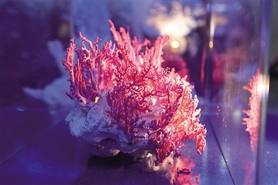 此外,博物馆中还保有十分珍稀的珊瑚标本。其中最为珍贵的是一株红珊瑚,红艳如火,被珍而重之地用玻璃罩保护着。此外还有同样十分名贵的黑珊瑚,是西沙特有的一种珊瑚,其质地细腻致密,呈灰黑色,常年在西沙作业的渔民也很少见过黑色的珊瑚。