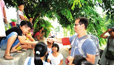 9月13日,36岁的美国教师Ken在海口市琼山区滨江街道东门社区与孩子们玩起了英文版的石头剪子布游戏,孩子们在欢笑中学会了很多单词。据悉,海口市外事侨务办推出“海南国际旅游岛· 外国友人与我同行”系列活动,充分调动常驻海口的千名外国友人热情,让他们积极了解与关注海口,宣传海口。本报记者 苏建强 摄影报道