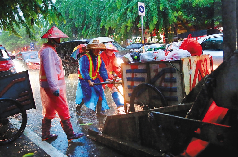 9月15日,在海口市琼山区文庄路上,琼山区环卫局第一清扫大队的环卫工人冒着大雨,进行街道保洁工作。他们冒雨劳动的身影,成为海口“双创”行动中一道美丽风景线。据了解,该局1200多名环卫工人,不顾日晒雨淋,每天坚守在海口“双创”一线,为这座城市的文明卫生目标,默默付出自己的努力。