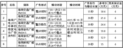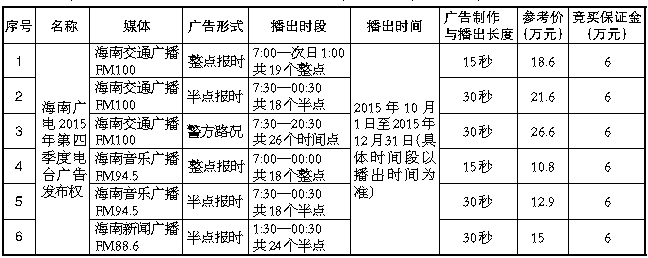 海南广电2015年第四季度电台广告发布权拍卖公告