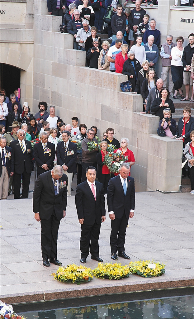 9月16日,在澳大利亚堪培拉的国家战争纪念馆,澳中友好交流协会会长周泽荣(前中)、澳大利亚战争纪念馆馆长布兰登·尼尔森(前右)和澳大利亚国防军代表海军上将肯·杜兰(前左)在华裔军人纪念活动上向无名烈士敬献花圈。 当日,澳大利亚国家战争纪念馆首次举行仪式,向历次战争中的澳大利亚华裔军人表达敬意。如此高规格地纪念华裔军人这一群体,在澳大利亚历史上还是第一次。 新华社发
