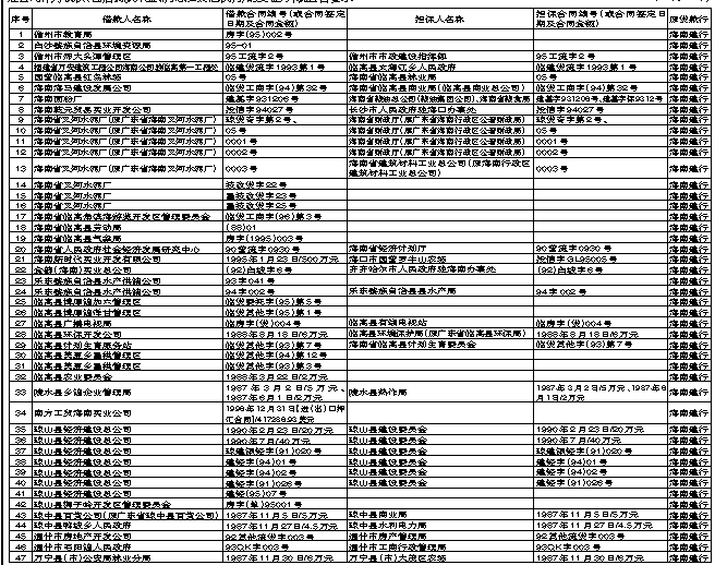 根据《债权转让协议》,中国信达资产管理股份有限公司【海南省】分公司已将其依法享有的对下列债务人及其担保人享有的主债权及担保合同项下的全部权利依法转让给海南联合资产管理公司。海南联合资产管理公司作为债权(包括贷款本金、利息及其他权利)的受让方,现公告要求债务人、担保人及其他义务人立即向海南联合资产管理公司履行相应合同约定或法院判决所确定的义务(若债务人、担保人及其它义务人因各种原因更名、改制、歇业、吊销营业执照或者丧失民事主体资格,请相关承债主体、清算主体代为履行义务或者承担清算责任)。特此公告。