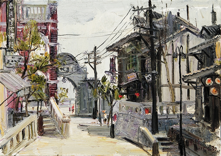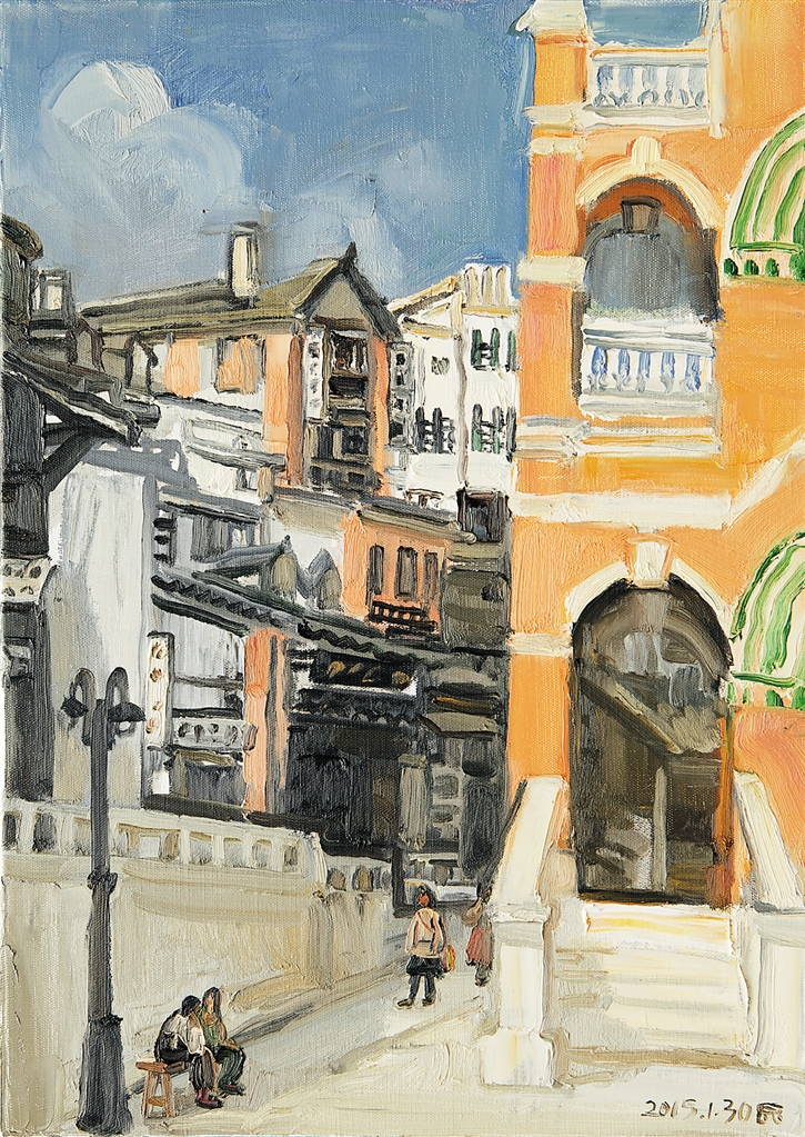 厦门大学艺术学院教授张立平,长期生活在中西文化交融的厦门,他画的骑楼老街,既带有装饰性,又有书法的写意性,像是写出来的,又追求西化的色彩斑斓与灿烂,很雅致,有跳跃。