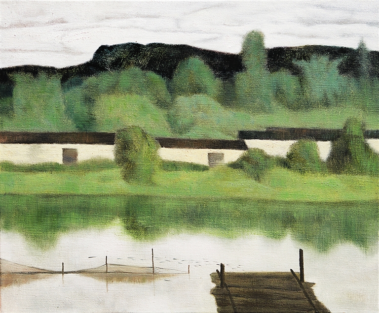 即使同样是画海南的绿色,因为各个作家的性格不同,表现风格也大相径庭, 四川美院教授翁凯旋,画的是海口的绿道,他擅用冷色调,在一片绿的冷色调中又突出白色,画面雅致洒脱,而海口美协主席王锐的油画《渡,》则显现出一片静谧的绿,画面整洁有序。