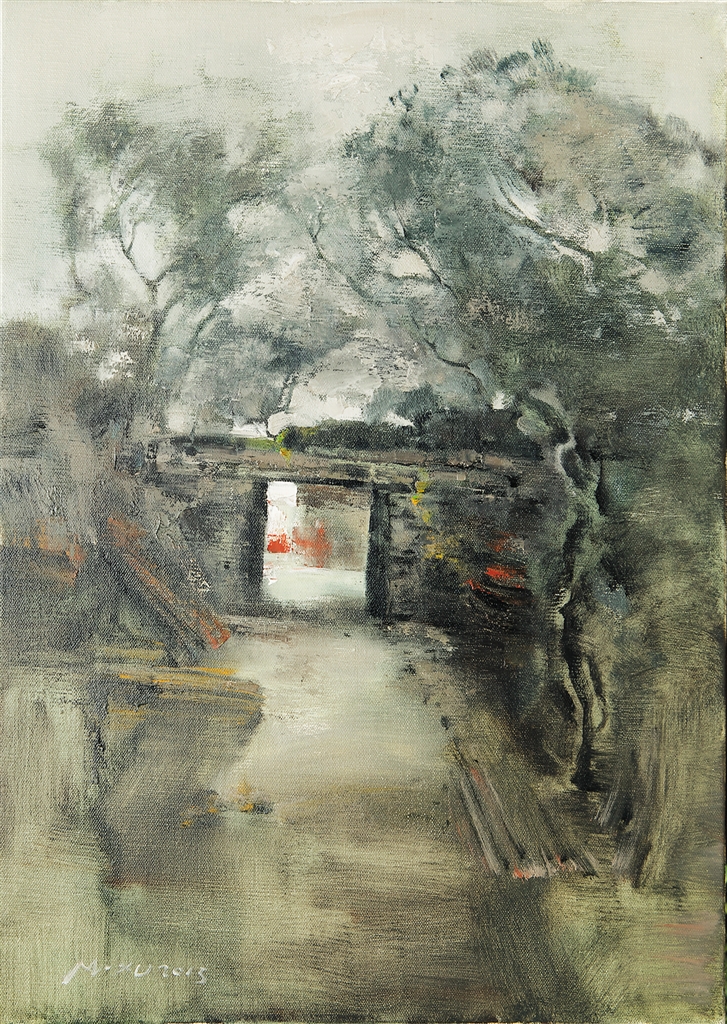 上海油画雕塑院一级美术师罗郎的作品就取材于观澜湖的一个小角落回廊,整个作品风格随意轻松,尝试将中国传统画的写意与油画的光色、严谨的造型结合起来,做了很多探索。本次画展的策划人、海口市美协主席、国家一级美术师王锐说,这种绘画风格和罗郎本人性格比较洒脱有关。