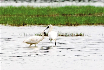 天鹅绒般的绿草随风而动。冯尔辉几个人在一处观测点观测时,一群白鹭闯入了他们的视野,它们有的淌水觅食,有的在太阳照耀下扑闪着翅膀,灿烂而欢愉……冯尔辉条件反射似的举起相机,“咔嚓”,拍下了距离两三百米以外的白鹭群。