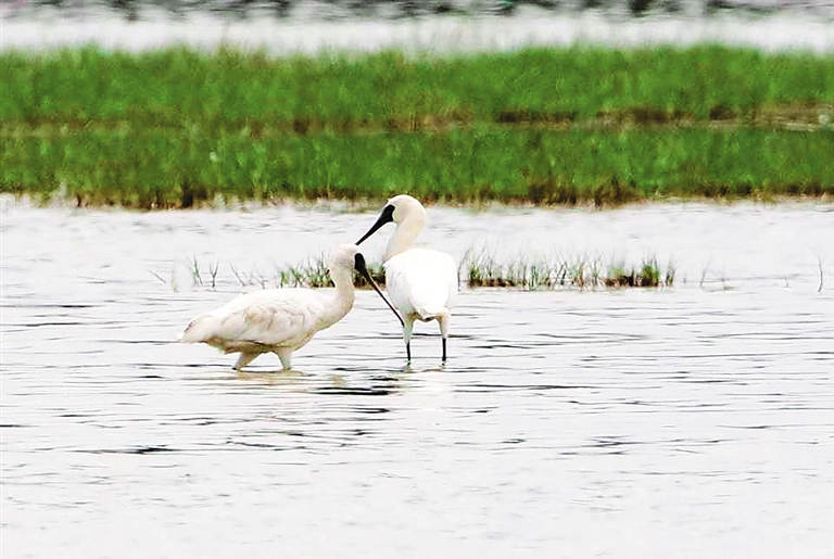 一张扁平的大嘴,一身洁白的羽翼,晃动脑袋在水中划拉觅食时呆萌,展开双翅在空中飞行时体态优雅——这就是黑脸琵鹭,属于国家二级保护动物、全球濒危的鸟类之一,它对环境十分敏感,世界野生动物保护基金会将之列为生态环境的指示性物种。