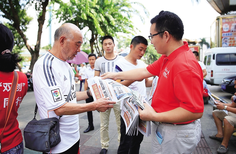 9月20日,以“海口‘双创’ 海报同行”为主题的海南日报报业集团“双创”系列活动启动仪式在海南日报社举行,集团300多名职工身穿统一文化衫参加“双创”誓师大会。会后,集团员工走上海口街头进行“双创”宣传活动。 本报记者 张杰 摄