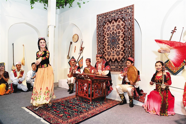 9月20日,演员在新疆维吾尔自治区成立60周年成就展上表演。 当日,新疆维吾尔自治区成立60周年成就展在北京开幕。 新华社记者 陈晔华 摄