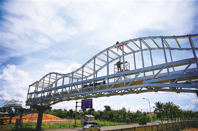 9月19日,在海口市滨江西路和风江岸小区东门以北,工人们正在给在建的过街天桥安装防护玻璃。该天桥完工后,将大大方便道路两侧居民通行,以及公交站的乘客出行换乘。据了解,滨江西路是海口沿江景观路,但路宽车多,市民要想越过滨江西路,前往南渡江岸观景并不容易。