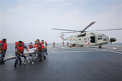 9月20日,中国海军和平方舟医院船医护人员从舰载救护直升机上转运“落水人员”。 “和平友谊-2015”中马实兵联演海上科目演练20日在马六甲海峡演习预定海域全面展开,双方参演部队先后演练了联合解救被劫持船只、实际使用武器和联合搜救3个课目。 新华社发