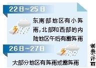 22日~25日,受偏南气流影响,全岛多云,其中东南部地区有小阵雨,北部和西部的内陆地区午后有雷阵雨;最高气温维持。26日~27日,受南海辐合带和弱冷空气共同影响,全岛多云,大部分地区有阵雨或雷阵雨;最高气温略有下降。各预报海区风力5~7级。