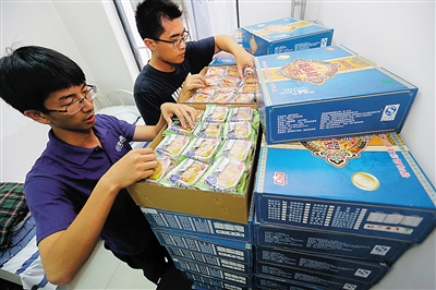 9月22日,委托厂家生产的首批“南开月饼”到货,团队成员吕松鸿(左)、徐先一清点数量。 中秋佳节将至,南开大学五名研究生推出他们一起设计的具有校园特色的“南开月饼”,五名学生一同设计、推广并联系厂家制作。在通过微信公众账号推广半天后,“南开月饼”的订购量就已达到上千块。 新华社发(刘东岳 摄)