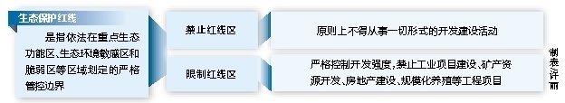 生态保护红线是指依法在重点生态功能区、生态环境敏感区和脆弱区等区域划定的严格管控边界,分为禁止红线区和限制红线区。其中,在禁止红线区内,原则上不得从事一切形式的开发建设活动;在限制红线区内,严格控制开发强度,禁止工业项目建设、矿产资源开发、房地产建设、规模化养殖等工程项目。划定生态保护红线是我省总体规划的基础。