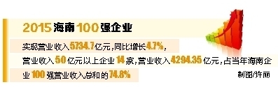 据介绍,我省百强企业入围门槛连续10年保持较快增长,今年海南企业100强整体经营保持了持续较快健康发展的态势,2015海南100强企业实现营业收入5734.7亿元,比上年的5476.02亿元增长4.7%。全省100强企业中营业收入50亿元以上企业14家,营业收入4294.35亿元,占当年海南企业100强营业收入总和的74.8%,是我省经济当之无愧的“台柱子”和“领头雁”。