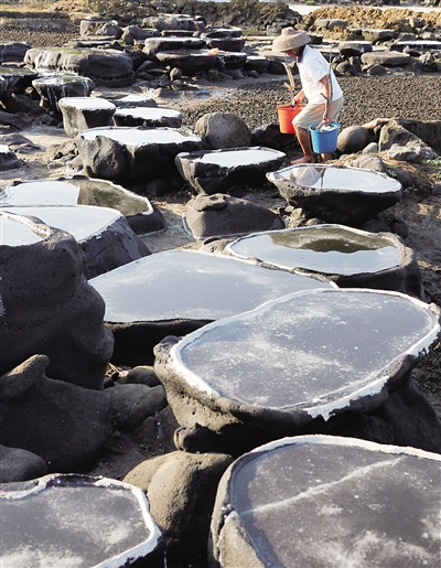 古韵二,古盐槽。据统计,峨蔓盐田共有砚式石盐槽7500多个,其中盐丁村有5000多个、灵返村约1500个、细沙村约1000个。这些砚式石盐槽,用黑色的火山岩石凿刻而成,大多呈不规则圆形。