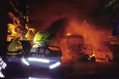 9月22日凌晨2时许,三亚市南边海路渔村路口停车场3辆汽车着火,无人员被困。三亚消防出动了8吨水罐消防车、8吨水罐泡沫车和抢险救援消防车,18名指战员赶赴现场,经过近1个小时的紧急处置,成功处理险情。
