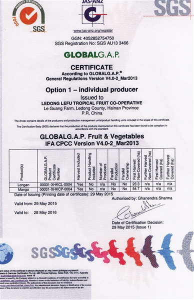 2012年3月,在省质量技术监督局指导下,海南海垦农资公司抓住农垦改革的机遇,在农垦总局支持下,与全球最大良好农业认证机构SGS合作,在乐东乐光农场等地芒果种植园试点全球良好农业规范并取得成功,种植的芒果不仅产量增加,而且品质大幅提升,亩均增收1000元至2000元不等。