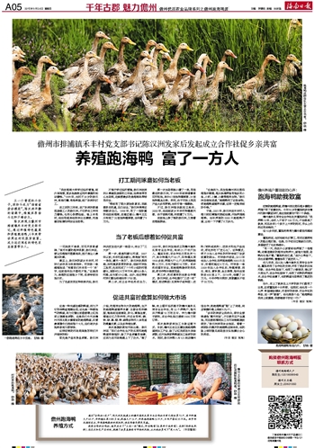 于是,2001年,陈汉洲在禾丰村入海口附近清理河湖或池塘,开始养殖跑海鸭。当年养殖的3000只跑海鸭产蛋,让他一下子赚了8万多元。