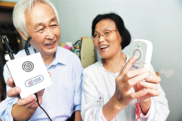 9月23日,合肥市蜀山区竹荫里社区的一对老夫妇在展示“养老智能小白”。老人们可以通过这个互联网设备一键式呼叫子女和社区医生,也可收听子女通过手机发来的提示语音。 从本月起,安徽省合肥市蜀山区竹荫里社区的老人们开始用上了高科技的智能养老设备。据介绍,合肥市蜀山区竹荫里社区是安徽省智能化社区养老服务试点之一,社区居民可以通过家中和社区配备的互联网智能化设备及时掌握自身健康状况、一键式联络子女和快速就医。新华社发