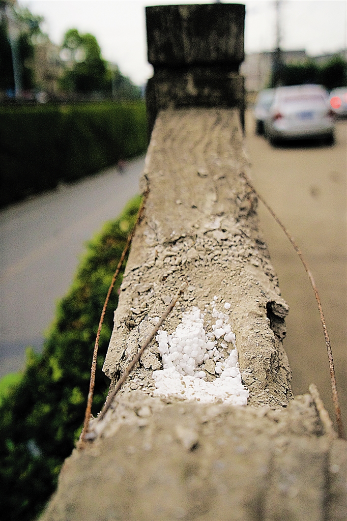 这是护栏内部暴露出的泡沫填充物。 9月22日,记者在江西九江瑞昌市湓城路瑞昌第四中学附近一铁路桥涵洞发现,该挡土墙护栏多处出现断裂,内部填充有大量泡沫,多根钢丝裸露在外。 据了解,该护栏工程为2012年市政维护工程,预算审核价为20.9万元。在工程建设过程中,原施工单位擅自变更设计,未按施工图施工,使用了填充泡沫的预制件,有关人员对工程监管存在失职。 目前,相关施工公司已被处以5万元罚款,并责成该公司对不合格的护栏无偿更换。此外,当地政府对负有领导责任的相关单位负责人员也进行了问责处理。 新华社记者 胡晨欢 摄