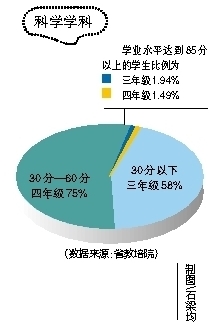 上期教育周刊独家刊发了省教育研究培训院完成的我省小学中低段学生学业水平测试报告,报告披露了语文、数学、口算和科学学科学业水平数据,其中科学学科学业水平达到85分以上(水平4)的学生比例为三年级1.94%,四年级1.49%,学生基本没有科学知识积累能够支撑后续学习,科学课形同虚设。