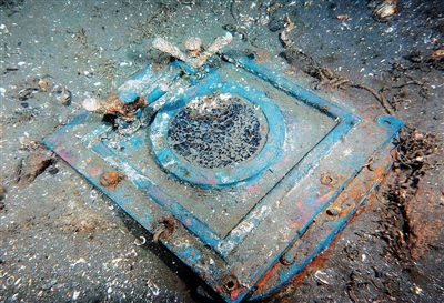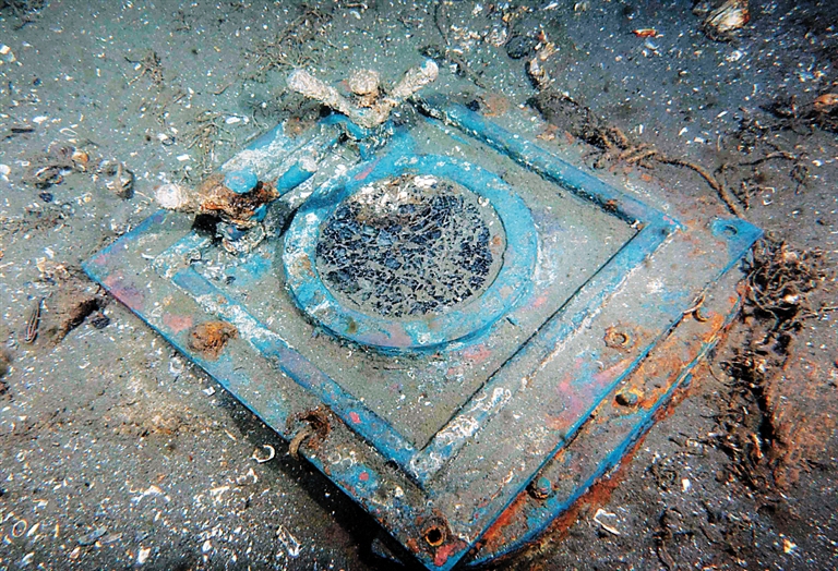 这是考古现场发现的方形舷窗。近日,考古学家在黄海探明了一艘甲午海战中沉船的真实身份,经初步确认为北洋水师的致远舰。新华社发