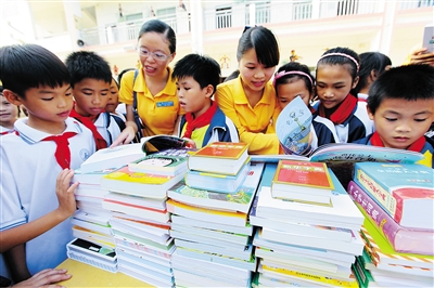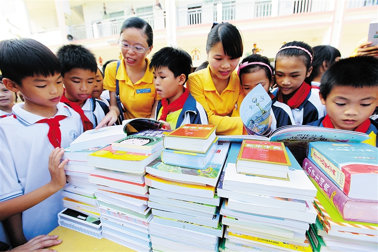国庆前夕,三亚南山景区开展关注留守儿童,关爱祖国花朵活动,把图书和文体用品送到农村少数民族小学,让留守儿童和农民工子女度过一个愉快、温馨的国庆节。