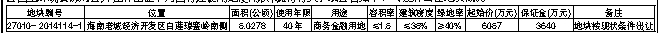 二、竞买人资格:(一)中华人民共和国境内外的法人和其他组织(除法律另有规定者外)均可参加竞买。属境外机构(含港、澳、台地区)申请参加竞买的,按照规定需要提交商务主管部门核发的《外商投资企业批准证书》和工商主管部门核发的《营业执照》。本次挂牌出让不接受联合竞买。(二)本次国有土地使用权挂牌出让按照价高者得原则确定竞得人。三、竞买申请和登记:有意参加竞买者应于2015年10月8日-2015年10月28日下午17时整(北京时间)到澄迈县国土环境资源局五楼土地交易所(或海南省政务服务中心二楼省公共资源交易中心22号窗口)查询和购买《澄迈县国有建设用地使用权挂牌出让手册》,并按挂牌出让手册的具体要求报名参加竞买。报名时,竞买申请人应缴交竞买保证金(以保证金到账为准)。四、挂牌报价时间和地点:挂牌起始时间:2015年10月20日 上午10时整(北京时间)。挂牌截止时间:2015年10月30日 上午10时整(北京时间)。挂牌地点:海南省政府会展楼二楼省公共资源交易服务中心土地交易厅进行。本次挂牌出让活动报价阶段只接受书面报价,不接受电话、邮寄、电子、口头等其他方式报价。五、其他事项:(一)竞买成交当天签订《成交确认书》,并在10个工作日内与我局签订《国有建设用地使用权出让合同》,竞买保证金自动转作受让地块的合同价款,合同签订后1个月内必须缴纳不低于出让价款60%的首付款,余款按出让合同约定的时间付清。(二)受让人取得土地使用权后,应严格按照规划要求建设。涉及水务、绿化、环保、消防、交通管理等应符合国家和海南省的有关管理规定。(三)成交价款不含各种税费(耕地占用税及相关税费由竞得人按有关规定缴纳),挂牌佣金按有关规定收取。(四)本公告未尽事宜详见《澄迈县国有建设用地使用权挂牌出让手册》。