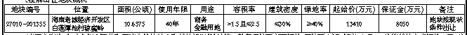 二、竞买人资格:(一)中华人民共和国境内外的法人和其他组织(除法律另有规定者外)均可参加竞买。属境外机构(含港、澳、台地区)申请参加竞买的,按照规定需要提交商务主管部门核发的《外商投资企业批准证书》和工商主管部门核发的《营业执照》。本次挂牌出让不接受联合竞买。(二)本次国有土地使用权挂牌出让按照价高者得原则确定竞得人。三、竞买申请和登记:有意参加竞买者应于2015年10月8日—2015年10月28日下午17时整(北京时间)到澄迈县国土环境资源局五楼土地交易所(或海南省政务服务中心二楼省公共资源交易中心22号窗口)查询和购买《澄迈县国有建设用地使用权挂牌出让手册》,并按挂牌出让手册的具体要求报名参加竞买。报名时,竞买申请人应缴交竞买保证金(以保证金到账为准)。四、挂牌报价时间和地点:挂牌起始时间:2015年10月20日 下午15时整(北京时间)。挂牌截止时间:2015年10月30日 下午15时整(北京时间)。挂牌地点:海南省政府会展楼二楼省公共资源交易服务中心土地交易厅进行。本次挂牌出让活动报价阶段只接受书面报价,不接受电话、邮寄、电子、口头等其他方式报价。五、其他事项:(一)竞买成交当天签订《成交确认书》,并在10个工作日内与我局签订《国有建设用地使用权出让合同》,竞买保证金自动转作受让地块的合同价款,合同签订后1个月内必须缴纳不低于出让价款60%的首付款,余款按出让合同约定的时间付清。(二)受让人取得土地使用权后,应严格按照规划要求建设。涉及水务、绿化、环保、消防、交通管理等应符合国家和海南省的有关管理规定。(三)成交价款不含各种税费(耕地占用税及相关税费由竞得人按有关规定缴纳),挂牌佣金按有关规定收取。(四)本公告未尽事宜详见《澄迈县国有建设用地使用权挂牌出让手册》。联系人:王先生、李先生;http://www.ggzy.hi.gov.cn、电话:0898-67629052、67629310、65303602