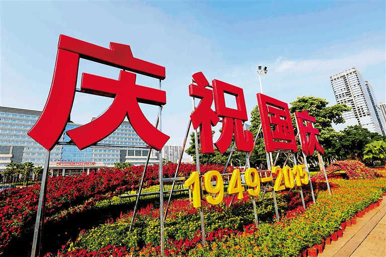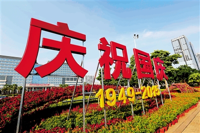 9月29日,在海口市国兴大道,鲜花装点着街道的两边,国庆节的喜庆气氛越来越浓厚。 本报记者 陈元才 摄