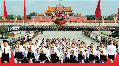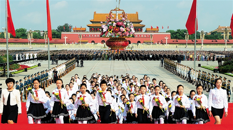 天安门广场,红旗招展,鲜花吐蕊。广场中央,主题为“祝福祖国”的巨型花篮,寓意平安吉祥、和谐安康。广场南侧,专门为中国人民抗日战争暨世界反法西斯战争胜利70周年庆祝大会搭建的大型长城主题花坛,展现出祖国壮美山河的动人画卷。约3000名首都各界代表手持鲜花,面向人民英雄纪念碑列队肃立。他们中有白发苍苍的老战士、老同志,有光荣的烈士亲属,有正在中央党校学习的200多位县委书记,也有朝气蓬勃的青年学生和少年儿童。