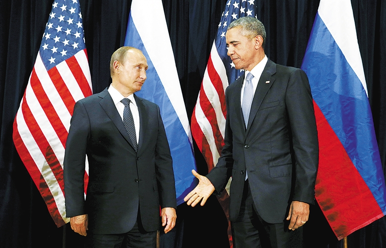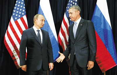9月28日,美国总统奥巴马(右)与俄罗斯总统普京在纽约联合国总部会谈。 奥巴马与普京28日在联合国大楼内就乌克兰和叙利亚问题举行会谈,这是两国领导人近一年来首次会面。 新华社/路透
