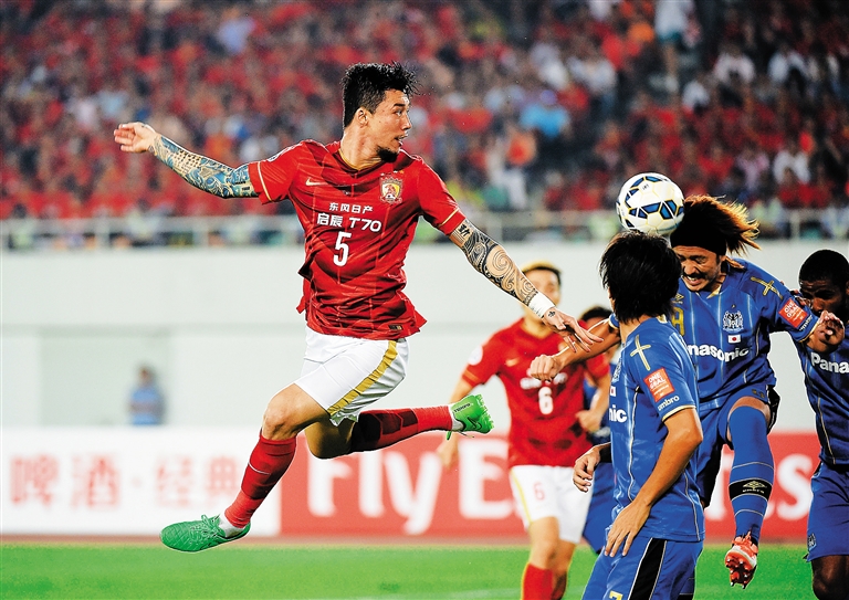 在广州举行的2015赛季亚冠联赛半决赛首回合比赛中,广州恒大队主场2:1胜大阪队。图为9月30日,广州恒大淘宝队球员张琳芃(左)在大阪钢巴队门前头球攻门。 新华社记者 刘大伟 摄