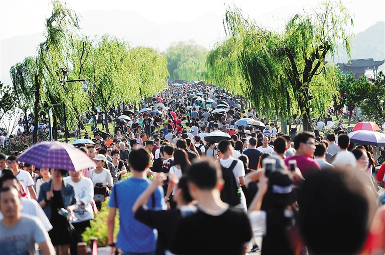 10月3日,杭州西湖白堤上游客众多。 当日是国庆小长假第三天,杭州西湖景区客流量居高不下。 新华社发