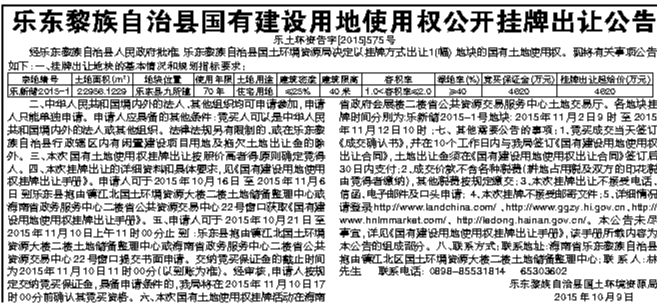 乐东黎族自治县国有建设用地使用权公开挂牌出让公告
