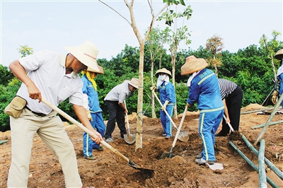 10月9日,儋州干部群众在那大城北新区及各镇、农场内,种植乌墨、蔷薇钟花、宫粉紫荆、红花风铃木、长叶马府油等树苗。据介绍,近5年来,儋州组织开展义务植树活动60多场,植树逾500万株。本报记者 易宗平 摄