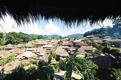 这是10月3日拍摄的翁丁古寨茅屋。 位于中国西南边陲的云南省沧源佤族自治县翁丁村,是一个有着数百年历史的佤族原始群居村寨。翁丁村至今仍保留着完整的佤族传统杆栏式茅草房以及各类佤族祭祀房、神林、木鼓房,当地人还保留着着一些传统习俗,翁丁村寨以其原始佤族民居建筑风格和原始佤族风土人情,入选中国传统村落名录,现在已成为国内外游客参观游览的地方,全村佤族群众每户年接待游客一项分红可达10000多元。 新华社记者 杨宗友 摄