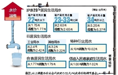 非居民生活用水中,工业用水从2.4元/立方米调整为2.42元/立方米,其他用水从3.2元/立方米调整为3.22元/立方米。特种行业用水从10元/立方米调整为10.02元/立方米;合表居民生活用水从1.77元/立方米调整为1.79元/立方米,低收入困难家庭生活用水从1.00元调整为1.02元/立方米。