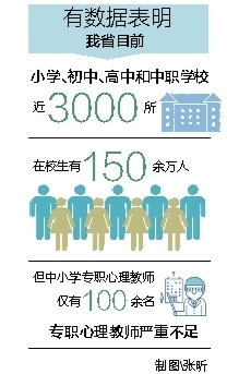 但尽管如此,现有心理健康教育课程和专职教师的配备离实际需求还有很大的差距。有数据表明,我省目前有小学、初中、高中和中职学校近3000所,在校生有150余万人,但中小学专职心理教师却仅有100余名,专职心理教师严重不足。