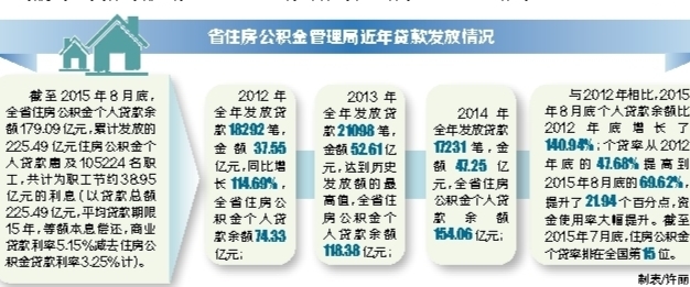 自2012年起,我省住房公积金贷款发放量实现跨越式增长,而截止到2015年8月底,全省住房公积金个人贷款余额179.09亿元,累计发放住房公积金个人贷款225.49亿元。与2012年相比,2015年8月底个人贷款余额比2012年底增长了140.94%;个贷率从2012年底的47.68%提高到2015年8月底的69.62%,提升了21.94个百分点,资金使用率大幅提升。