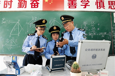 10月14日,合肥市蜀山区卫计局卫生监督所工作人员在科学岛实验中学教室内进行空气微小气候测量。 近日,安徽省合肥市蜀山区开始对辖区部分中小学校教室及学习环境情况进行专项检查。据介绍,此次给教室做“体检”的检查项目包括教室空气微小气候以及教室采光和照明等国家标准要求项目。该专项检查结束后,卫生部门将会同教育等部门对不符合国家标准的教室进行整改,以保障学生们健康学习。 新华社记者 郭晨 摄