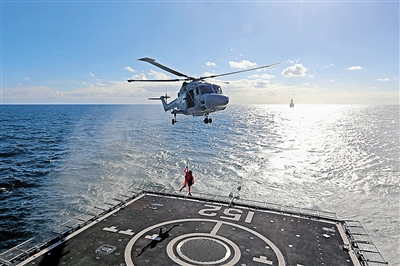 10月14日,参加联合军事演练的法国海军“拉图什·特维尔”号驱逐舰舰载直升机运送法方联络官至中国海军济南舰。 当地时间10月14日下午,正前往环球访问第七站——葡萄牙里斯本进行友好访问的中国海军152舰艇编队,途经法国罗斯科夫以北海域时,与法国海军举行了联合军事演练。 新华社发(曾涛摄)